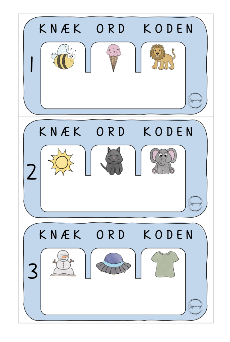 Børnene kan sætte klemmer, placere små kloder eller andet, for at markere hvilke ord, der starter med lyden. Print, klip og laminer, så de kan bruges igen og igen.