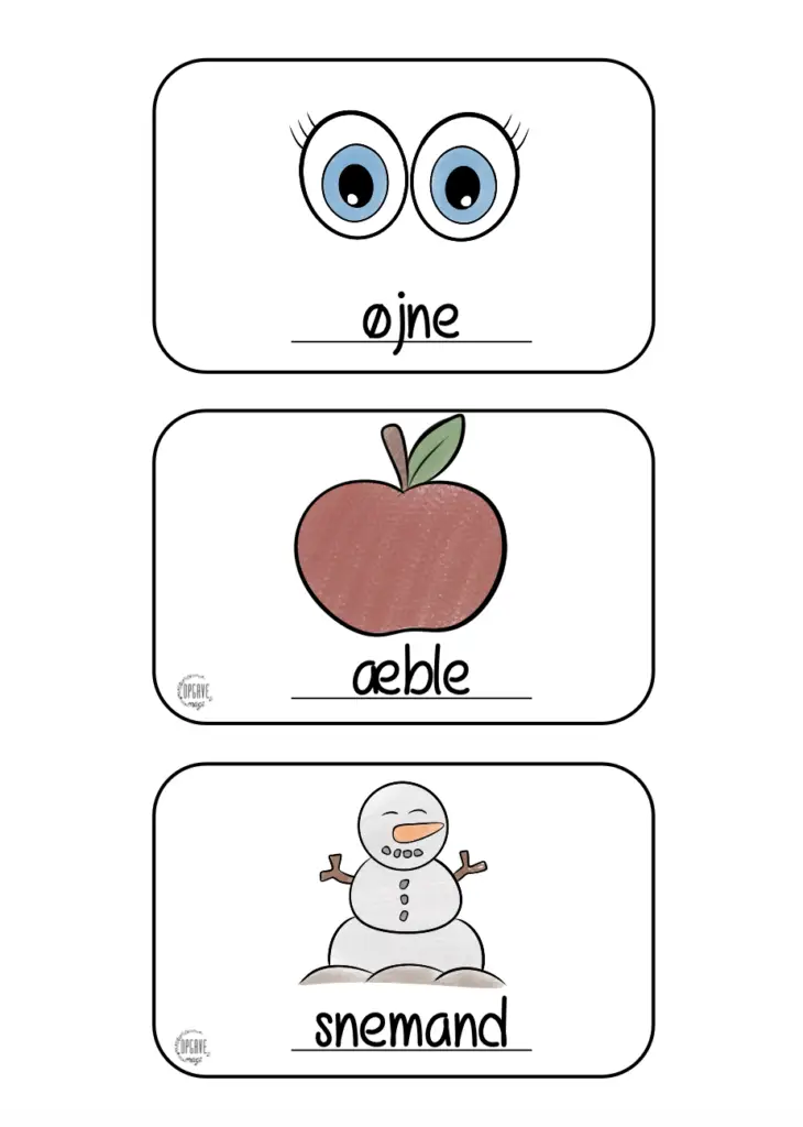 Børnene skal finde et kort med billeder og efterfølgende skrive ordet på skrivearket.